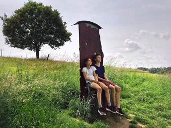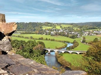 Vom Wanderparkplatz Stein geht es zunächst über einen Wiesenweg hinauf auf einen Bergrücken mit atemberaubendem Blick auf die Burganlage Blankenberg. Ein etwas windigerer Tag sorgt für ein besonderes Erlebnis am „Klangthron“. Ein schmaler Pfad führt hinunter zu Fischteichen und dem Naturschutzgebiet „Ahrenbachtal und Adscheider Tal“. Unter urigen Eichenbäumen folgt ihr einer naturnahen Bachaue. Hier sind Spechte und Rotkehlchen zu Hause, im Sommer segeln Libellen übers Wasser. Ein Wiesenweg führt zu einem kurzen Asphaltstück, das ihr hinauf bis zur Höhe wandert, wo es auf einem Feldweg weitergeht. Auf den hoch gelegenen Wiesen und Weiden am Weg wachsen Obstbäume und grasen Schafe und Ziegen. Früher standen hier die Rebstöcke des Burgbergs. Durch das imposante Katharinentor erreicht ihr Stadt Blankenberg – der heutige Hennefer Ortsteil hat sich mit seinen Fachwerkhäusern und verwinkelten Gassen einen mittelalterlichen Charme bewahrt. Am Marktplatz vorbei verlasst ihr das Städtchen wieder und wandert Richtung Burgruine. Von einem Aussichtspunkt über dem steil abfallenden Hang habt ihr einen tollen Blick über einen Siegbogen und erfahrt spannende Details zur Entstehung der Landschaft. Umrahmt von Mauern und Hangwiesen mit alten Obstbäumen führt der Weg zurück in Richtung Startpunkt. Lasst den Blick schweifen: Das Siegtal zeigt sich hier von seiner Bilderbuchseite. Über steile Pfade und Treppen hinab kommt ihr wieder zum Wanderparkplatz Stein.