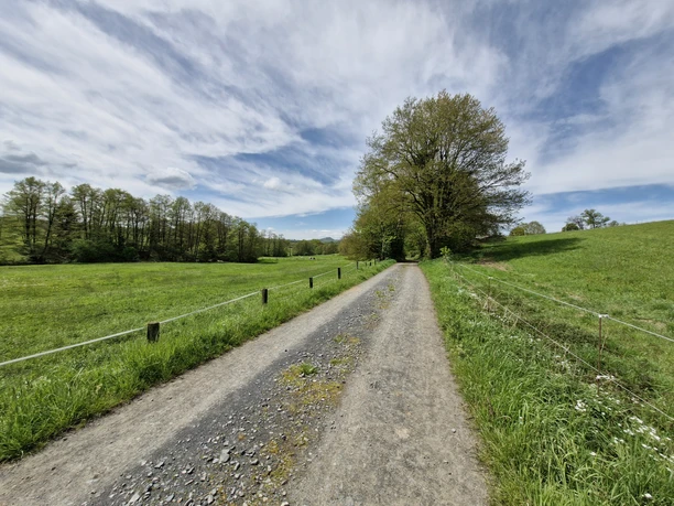 Am Bahnhof Hennef kannst du dich noch mit Proviant eindecken, bevor mit der Frankfurter Straße den schnellsten Weg aus der Stadt nimmst. Natur pur erwartet dich. Ein langezogener Gravelabschnitt bringt dich durch eine kleinteilige Kulturlandschaft – Wald und offene Zonen wechseln sich ab: Willkommen auf der historischen Schmalspurtrasse von Hennef nach Asbach (Westerwald)! Bis vor rund 70 Jahren transportierte ein privates Eisenbahnunternehmen Basalt aus den umliegenden Steinbrüchen durch das Hanftal Richtung Rhein. Dort wurde das Material für den Bau von Deichen und Kanälen in den Niederlanden und Belgien verschifft. Ab der ehemaligen Mühle Hermesbach wechselst du für rund 10 km auf wenig befahrene asphaltierte Landstraßen. Ab Krautscheid wechselst du das Tal und die Bahnstrecke. Um die ehemalige Pleistaler Trasse zu erreichen, querst du einen Höhenzug. Ab Rostingen führt dich ein Feldweg am Quirrenbach entlang ins Pleistal. Die schwarzen Splitberge am Fuß des Hühnerbergs illustrieren die immer noch bestehende wirtschaftliche Bedeutung des Basaltabbaus in der Region. Ab jetzt kurbelst du zusehends leichter, kleine Sträßchen und weitere Gravelabschnitte bringen dich bachabwärts über Ober- nach Niederpleis. Dort triffst du in der weiten Auenlandschaft der unteren Sieg auf den Radweg Sieg. Ausklang deiner Tour ist eine Deichsause flussaufwärts zurück zum Ausgangspunkt in Hennef.