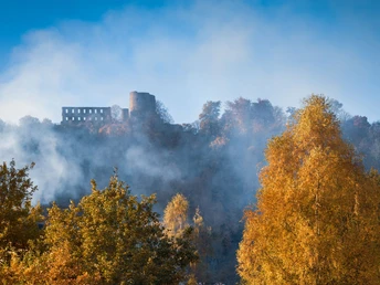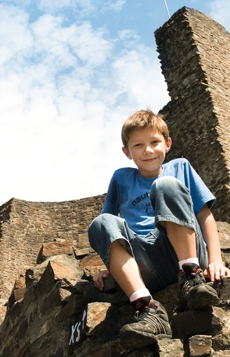 Die Handyführung startet bei der Infotafel an der Westseite der Burgruine und endet oben im Treppenturm neben dem großen Wehrturm.