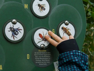 Große Aufregung im Bienenvolk: "Melli von Hüppelrott" ist verschwunden. Was ist passiert? Wenn du mehr über das Leben der Honigbiene erfahren möchtest und verstehen willst, wie sie im Wald und mit dessen anderen Bewohnern lebt; wenn du wissen willst, warum die Honigbienen in Gefahr sind und was wir alle dagegen tun können, dann bist du hier genau richtig: Wusstest du schon, dass in einem Bienenvolk bis zu 60.000 Bienen leben und arbeiten? Dass ein einziger Tropfen Honig das Lebenswerk einer Arbeitsbiene ist? Oder dass ein Bienenvolk für 500 g Honig umgerechnet dreimal um die Erde fliegt? Das alles und noch viel mehr erfährst du auf Melli‘s Bienenlehrpfad. Außerdem gibt er dir auch Gelegenheit, Melli von Hüppelrott und ihre Artgenossen mit allen Sinnen zu erfahren: Erlerne z.B. die Bienensprache durch Ertasten, schau dir eine Blumenwiese mit Bienenaugen an oder übernimm beim „Wabenspiel“ den Job einer Tankwart- oder Wächterbiene.