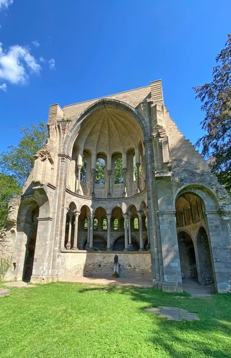 Das Heisterbacher Tal (Heister = Buche) wird damals auch Peterstal genannt. Die Umsiedelung hat praktische Gründe, denn im Tal gibt es Wasser, fruchtbare Böden und Anschlüsse an die Verkehrswege. Es entstehen zunächst Behelfsbauten, bis die Mönche 1202 mit der Errichtung der Klosterkirche und den Klausurgebäuden beginnen. Die Steine wurden in den nahegelegenen Steinbrüchen gewonnen. Zudem bauen sie auch unterirdische Wasserleitungen und legen Teiche für die Fischzucht an. Quelle und Info: www.abtei-heisterbach.de. Weiterhin beeinflussten die Mönche maßgeblich den Weinbau im Tal und wir wollen alle Stationen dieser Klosterlandschaft, die im Rahmen der Regionale 2010 viele neue Impulse und eine Rückbesinnung auf die Zisterzienser erfahren hat, besuchen und mit einer Wanderung verbinden. Dazu benutzen wir auch den ehemaligen Bittweg von Oberdollendorf hinauf zum Petersberg, der mit noch verbliebenen Wegekreuzen teilweise erlebbar ist.