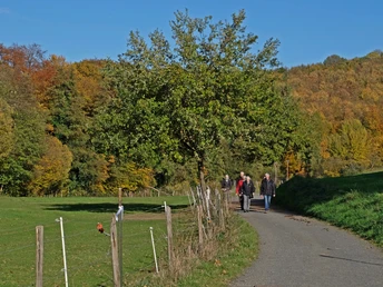 Der Wanderweg beginnt am neuen Parkplatz, der zum Kloster Heisterbach gehört und im Zuge der Regionale 2010 Projekte angelegt wurde. Vorbei am Weilberg, der mit seinem geologischen Aufschluss viel von der Entstehungsgeschichte des Siebengebirges preisgibt, erreichen wir die Kasseler Heide mit Feldern und Obstplantagen. Durch das ruhige, malerische Lauterbachtal steigen wir hinauf zum Blauen See und wieder hinab durch Obstplantagen zur ICE Strecke mit Autobahnbegleitung. Nur kurz gibt uns das Rauschen der Verkehrswege einen Einblick in die jüngste Landschaftsveränderung, bevor wir durch Neubaugebiete Richtung Kleiner Oelberg steil aufsteigen und in die ruhige Waldlandschaft am Rande von Thomasberg eintauchen. Und auch hier immer wieder tiefe Kraterseen am Wegrand, die eine Gemeinsamkeit haben: Steinabbau. Durch den lichten Laubwald mit viel Ilexbestand führt ein kleiner Rundweg, den das ehemalige Gut Buschhof angelegt hat. Am Rande der Tennisplätze zweigt ein schöner Waldweg ab, der uns zu den Rosenauwiesen bringt, die mit ihren Streuobstbeständen einen wertvollen Lebensraum darstellen. Am Wegrand finden wir nun das Einkehrhaus Waidmannsruh und biegen nach der Terrasse zum Stenzelberg ab, einem weiteren Steinbruch, der inzwischen als geschützter Lebensraum dient und mit dem Kloster Heisterbach als ehemaliger Steinlieferant eng verbunden ist.