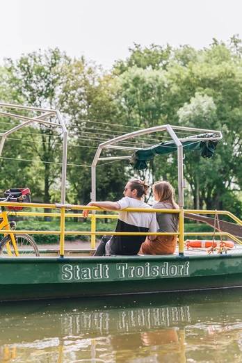 Auf dem Weg nach Bergheim trifft die Sieg auf die Agger. Am Knotenpunkt 29 folgst du der Ausschilderung „Siegmündung“ und da dann weiter nach Meindorf. Dabei bitte beachten, dass du nach Meindorf auf der Sankt Augustiner Seite fahren musst. Den kleinen Ort erreichst du nach ca. 5 Kilometern. Direkt am Wasser liegt ein schöner Spielplatz und für eine kleine Abkühlung kann man hier auch gleich in die Sieg springen. Frisch gebadet geht es auf dem Sattel weiter und nach ca. 2 Kilometern kommst du beim Restaurant zur Siegfähre an. Hier kannst du dich für die nächste Etappe stärken. Der idyllische Biergarten liegt direkt neben der ältesten und einzigen Einmannfähre Deutschlands. Diese sogenannte Gierfähre wird von einem Seil gehalten und durch die Strömung auf die jeweils andere Seite getrieben.