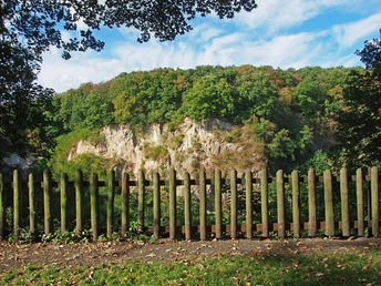 An der Steinbruchwand sind zwei Arten von Gestein zu sehen: Tuff und Basalt. Tuff entsteht bei explosivem Vulkanismus, wenn sich feinkörniges Auswurfmaterial aus einer Eruptionswolke an den Hängen des Vulkans ablagert. Dementsprechend weist der gelblich-bräunliche Trachyt-Tuff, der im oberen Teil der Steinbruchwand zu sehen ist, eine deutliche, schräg einfallende Schichtung auf. Er wird ganz oben noch von ungeschichtetem Latit-Tuff überlagert. Der untere Teil der Wand besteht aus Basalt. Die Basaltlava ist hier nicht an der Erdoberfläche ausgeflossen, sondern blieb bei ihrem Aufstieg im Trachyttuff stecken und breitete sich als sogenannter Lagergang in einer waagerechten Lage aus. Bei diesem Eindringen der über 1000°C heißen Schmelze wurde der Trachyttuff am Rand zum Basalt rötlich „gefrittet“ - ein Prozess ähnlich dem Brennen von Tonziegeln. Außerdem wurde der Trachyttuff beim Eindringen des Basalts in den Lagergang aufgewölbt, wodurch sich Dehnungsbrüche bildeten. Später drang noch einmal eine Basaltschmelze entlang eines ca. 1 m breiten, senkrechten Ganges durch Basalt und Tuff auf. Sie erweitert sich tulpenförmig nahe der Obergrenze des Steinbruchs. Diese kleinere Basaltmenge hatte nicht genug Wärmeinhalt, um den Trachyttuff zu fritten. Die auffallend ebene Geländeoberfläche schließlich, in die der Steinbruch eingeschnitten wurde, stellt eine Verebnungsfläche dar, die bei der Abtragung des Siebengebirgs-Vulkans entstand und in die sich die heutigen Täler, etwa das Rheintal, aufgrund der Hebung des Rheinischen Schiefergebirges eingeschnitten haben.